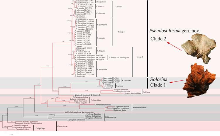 圖1.基於(yu) nrITS、nrLSU和mtSSU的地卷目(Peltigerales)係統發育樹。紅色標識的分支為(wei) 地卷科(Peltigeraceae),扁盤衣在該科下形成了獨立的分化支。