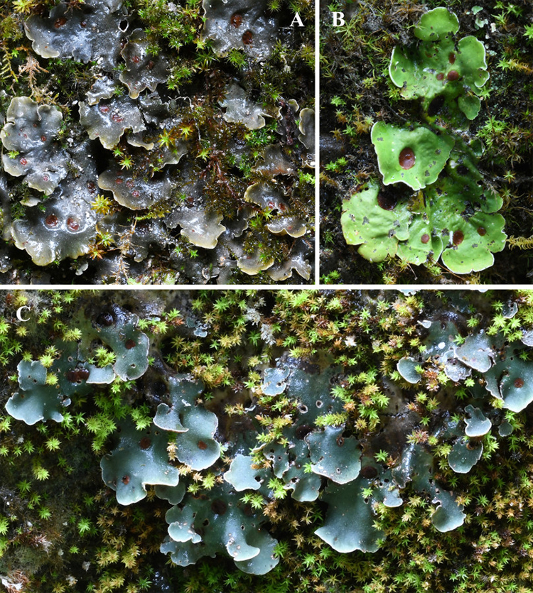 圖2.扁盤衣新種野外生境圖片:褐肝扁盤衣Pseudosolorina hepatizon,盾形扁盤衣P. parmigera(模式種),薄葉扁盤衣P. tenuior。